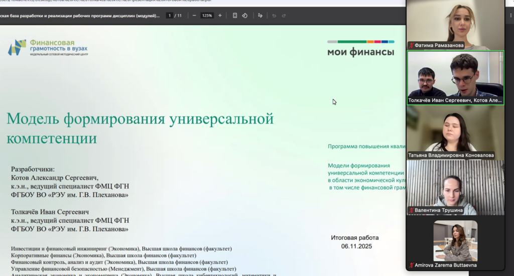 6 и 7 ноября 2025 года состоялись итоговые аттестации слушателей программ повышения квалификации «Модели формирования универсальной компетенции в области экономической культуры, в том числе финансовой грамотности» (набор 2025-3) и "Разработка рабочих программ дисциплин, обеспечивающих развитие общепрофессиональных и профессиональных компетенций по формированию финансовой грамотности учащихся школьного возраста" (набор 2025-3).