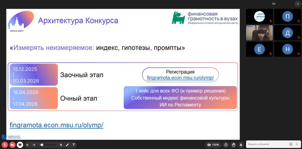 5 февраля 2026 года в 10:00 (по Москве) состоялся методический вебинар, посвященный Всероссийской олимпиаде экономического факультета МГУ им. М.В. Ломоносова по финансовой культуре и финансовой грамотности. Олимпиада проходит 9-ый год подряд, в этом году посвящена теме «Измерять неизмеряемое: индекс, гипотезы, промпты».