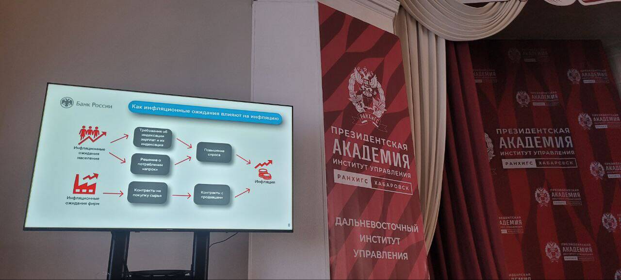 25 февраля в Дальневосточном институте управления – филиале РАНХиГС состоялась открытая лекция кандидата экономических наук, начальника экономического управления Уральского главного управления Банка России Василия Сергеевича Щербакова. Участниками мероприятия стали студенты и преподаватели вузов Хабаровского края, которые присоединились к лекции как очно, так и в онлайн-формате.