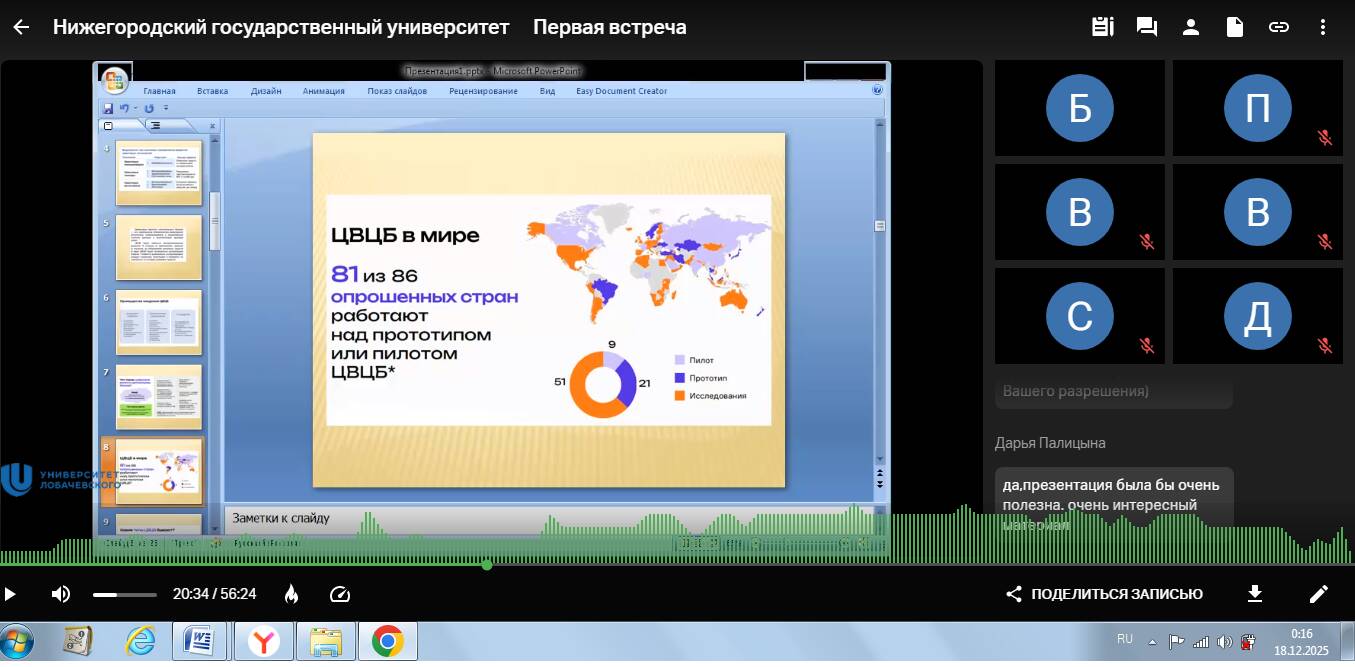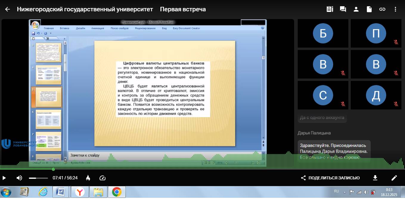 17 декабря 2025 г. (среда) в 12:20 ч. (мск.) состоялся методический вебинар для преподавателей вузов Нижегородской области. Доклад на тему "Цифровой рубль. Теория и практика российской экономики" представила региональный координатор М.В. Бузмакова. На семинаре были рассмотрены особенности современного финансового рынка и тренды, связанные с внедрением цифровых валют. Докладчик рассказала о сходстве и различии между цифровым рублём и криптовалютой.